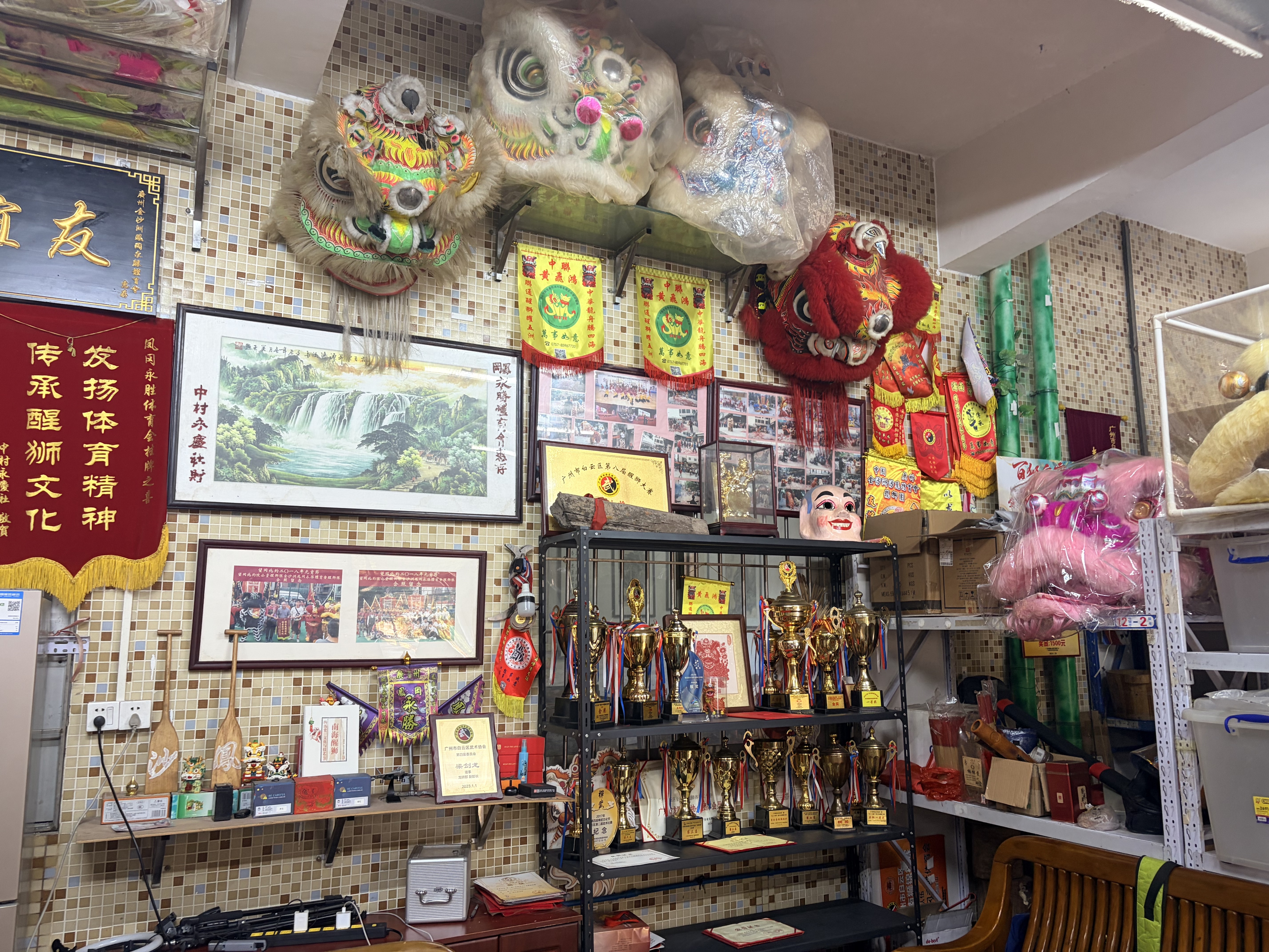 在训练基地内,珍藏着一面上世纪八十年代纯手工金丝缝制的头牌,旗面绣有“凤冈永胜体育会”字样及关帝图像,象征着对忠义仁勇精神的崇敬。体育会教练梁剑龙感慨道:“头牌是狮队的灵魂,百年浮沉间,它见证了我们不曾间断的传承。”如今,这支狮队已发展成为拥有20名资深队员、20名核心队员及10余名小学徒的规模,并于2024年正式加入广东省龙狮运动协会。