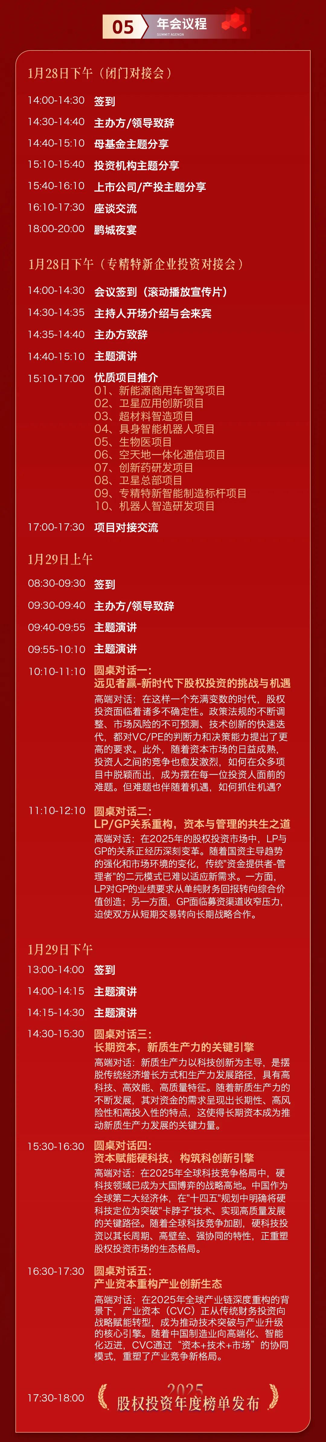 值得一提的是,投资家网旗下投资家研究院也将在1月29日当天发布,极具传播力的“2025股权投资年度系列榜单”。本次榜单分为机构榜、人物榜、产业榜。其中,机构榜将评选出“2025年度最佳早期投资机构”、“2025年度最佳创业投资机构”、“2025年度最佳私募股权投资机构”、“2025年度成长型投资机构”等。人物榜将评选出“2025年度最佳早期投资人”、“2025年度最佳创业投资人”、“2025年度最佳私募股权投资人”、“2025年度投资家”等。产业榜将在数字经济、先进制造与硬科技、低空经济与航空航天、半导体、新能源/新材料、人工智能、大健康等领域,评选出具有杰出贡献的投资人与投资机构。