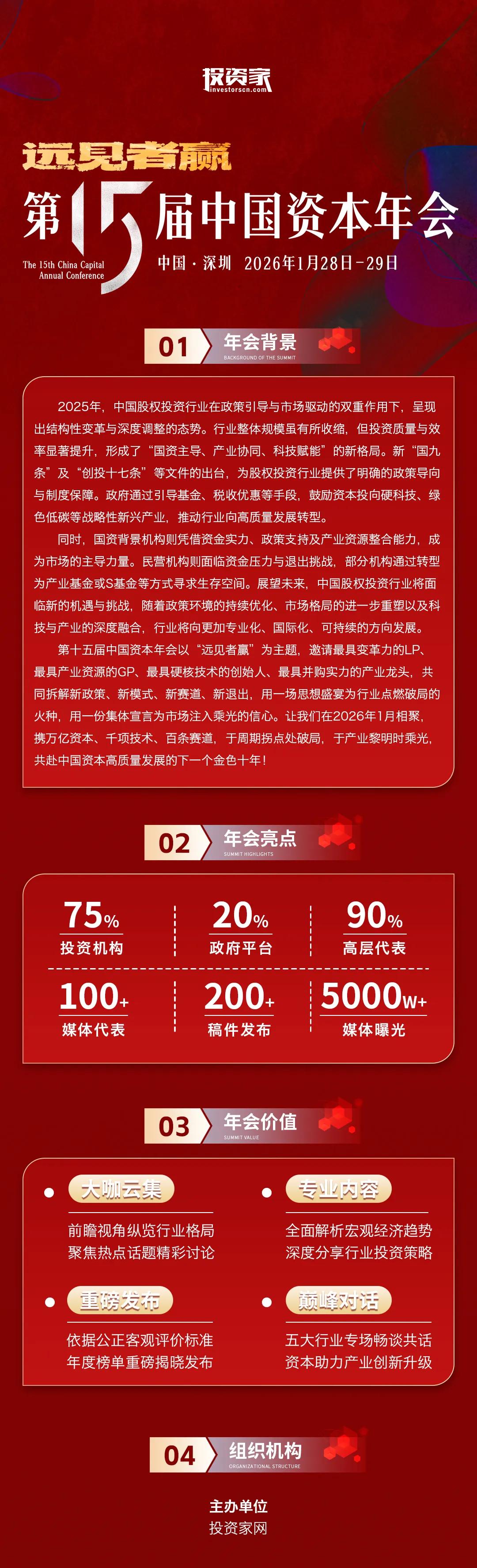 尽管VC/PE在2025年的投资、退出表现颇为亮眼,但股权投资市场仍面临诸多挑战、复杂多变。而真正的远见者需提前布局,在政策导向、技术趋势和市场需求的交汇点,爆发。作为股权投资行业的观察者、企业成长见证者,投资家网延续以往,计划2026年1月28-29日在深圳隆重主办“第十五届中国资本年会”。我们把这次会议主题定义为“远见者赢”。